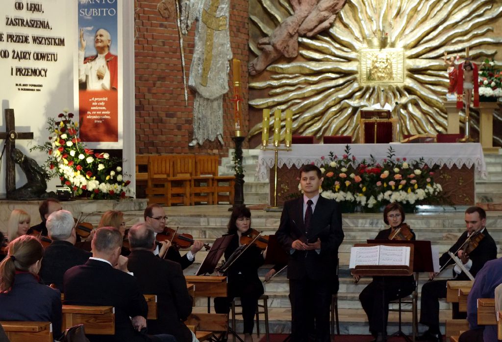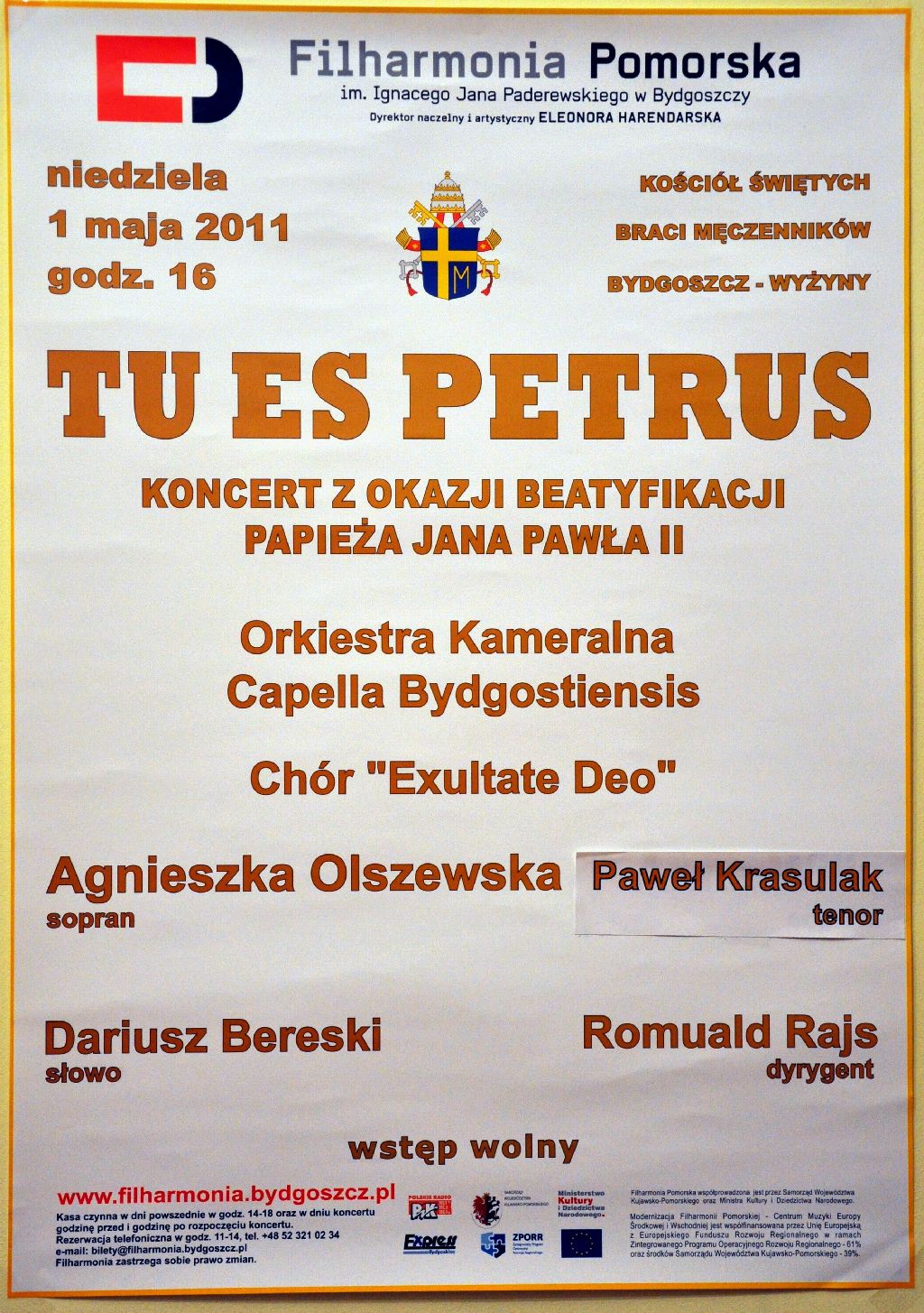 1 MAJA 2011 - W DNIU BEATYFIKACJI JANA PAWŁA II, ODBYŁ SIĘ W NASZYM KOŚCIELE UROCZYSTY, DZIĘKCZYNNY KONCERT ZATYTUŁOWANY „TU ES PETRUS" – TY JESTEŚ PIOTR. W KONCERCIE WYSTĄPILI: ORKIESTRA KAMERALNA FILHARMONII POMORSKIEJ W BYDGOSZCZY – CAPELLA BYDGOSTIENSIS, SOLIŚCI; AGNIESZKA OLSZEWSKA - sopran i PAWEŁ KRASULAK – tenor, DARIUSZ BERESKI – słowo ORAZ CHÓR „EXSULTATE DEO". DYRYGOWAŁ ROMUALD RAJS. KONCERT PROWADZIŁA URSZULA GUŹLECKA – red. TVP Bydgoszcz