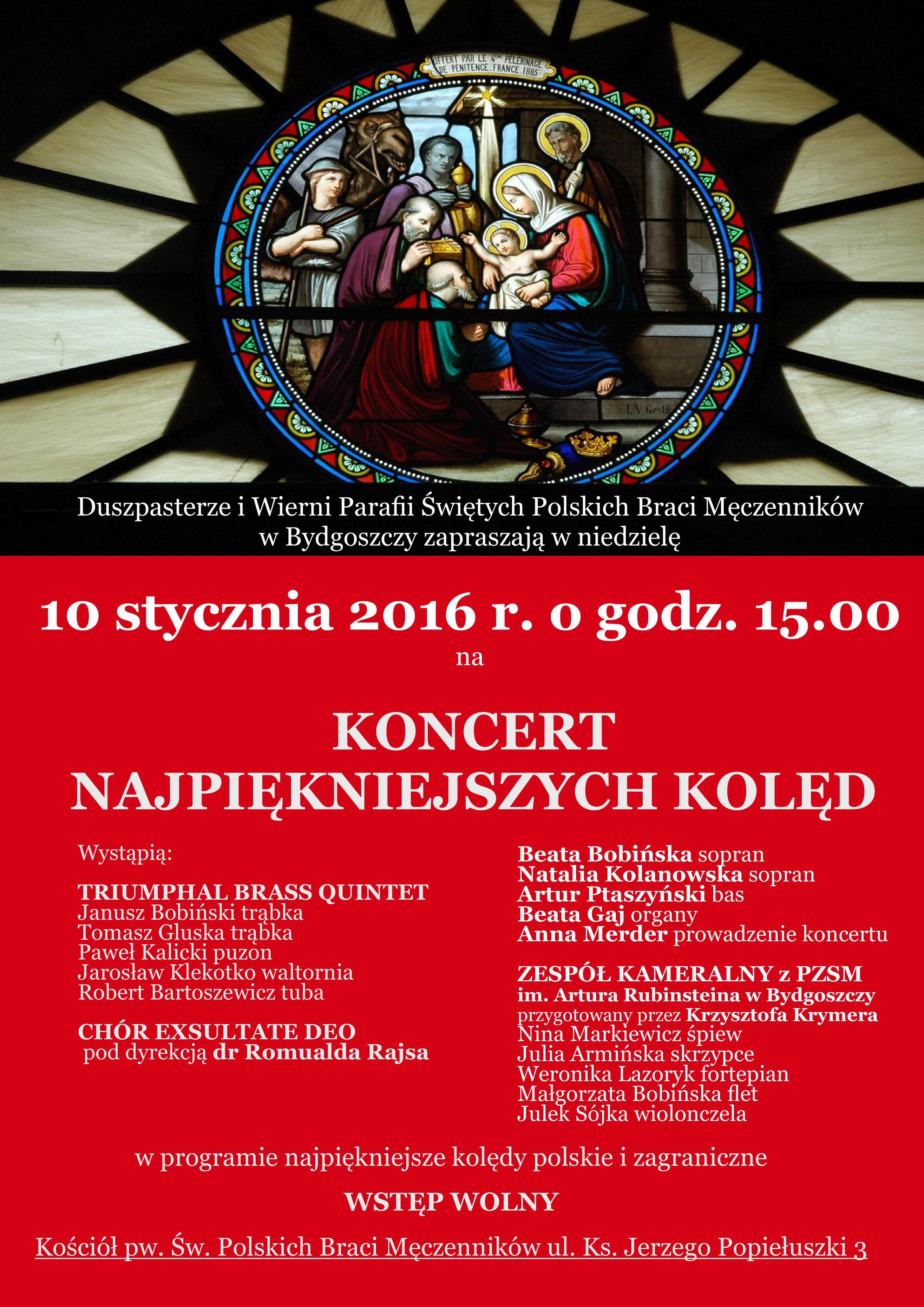 W Niedzielę Chrztu Pańskiego 10.stycznia 2016r. kilkuset słuchaczy, zgromadzonych w kościele pw. Św. Polskich Braci Męczenników, miało okazję wysłuchać (również śpiewając kolędy) niecodziennego Koncertu Najpiękniejszych Kolęd. Taki bowiem tytuł nadała temu kolędowaniu pomysłodawczyni, współorganizatorka i solistka koncertu - pani Beata Bobińska.