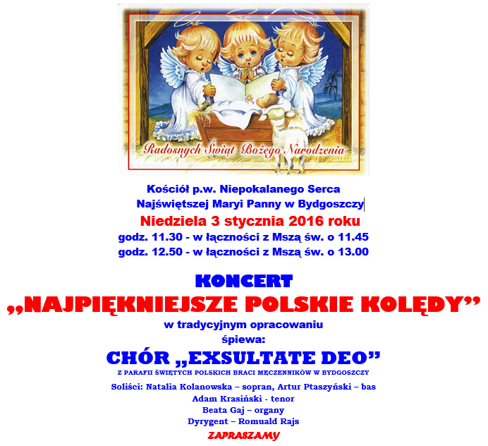 Niedziela 3 stycznia 2016 r. była dla chóru „Exsultate Deo” bardzo pracowita. Dwukrotnie bowiem wystąpił z koncertem kolęd, w łączności z mszą świętą, (o 11.45 i 13.00) w kościele pw. Niepokalanego Serca Najświętszej Maryi Panny w Bydgoszczy. Występy chóru spotkały się z dużym zainteresowaniem i bardzo przychylnym przyjęciem przez tamtejszych Ojców i Parafian. Podczas koncertów chórzyści wykonali ponad dwadzieścia kolęd.