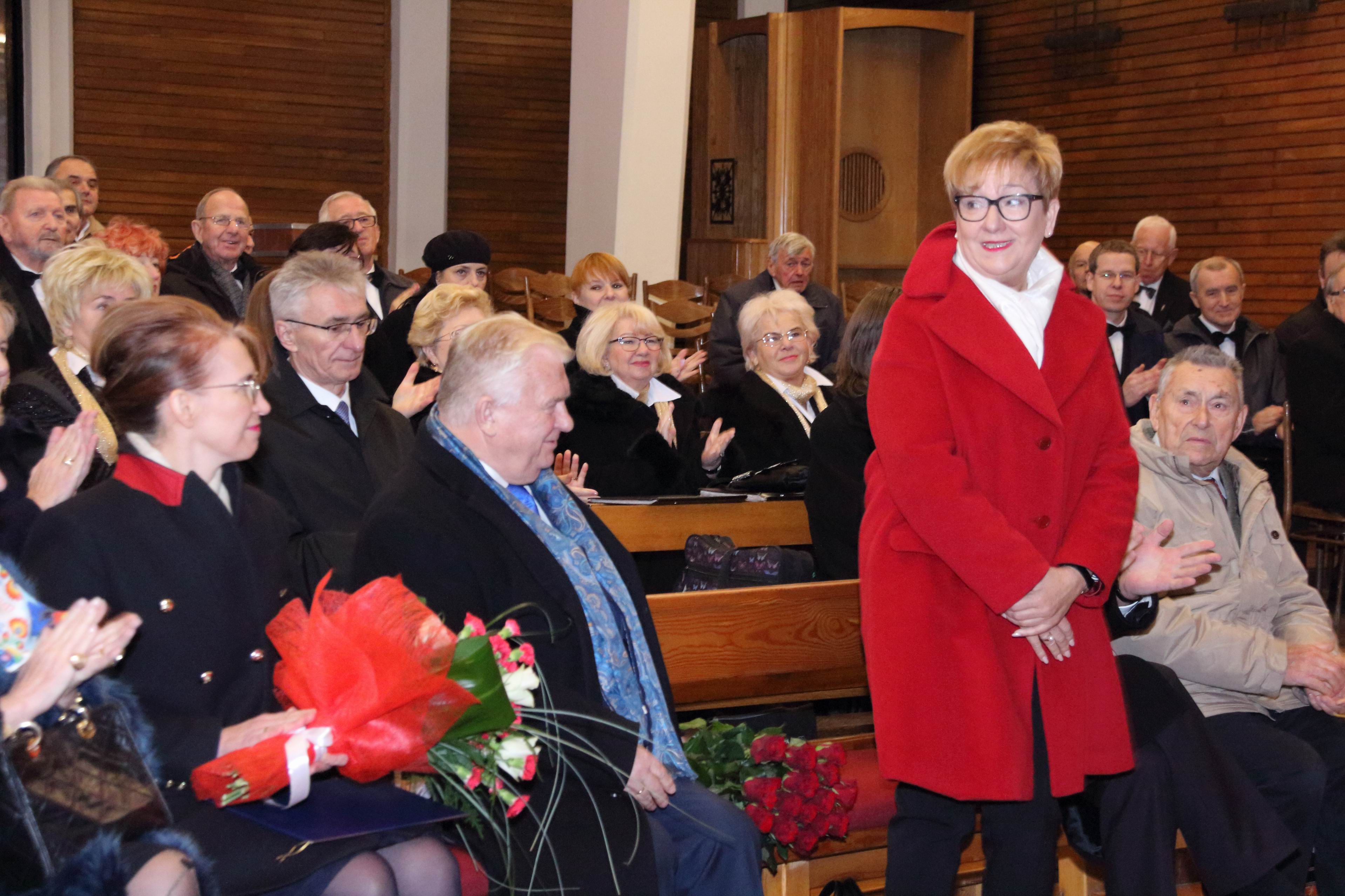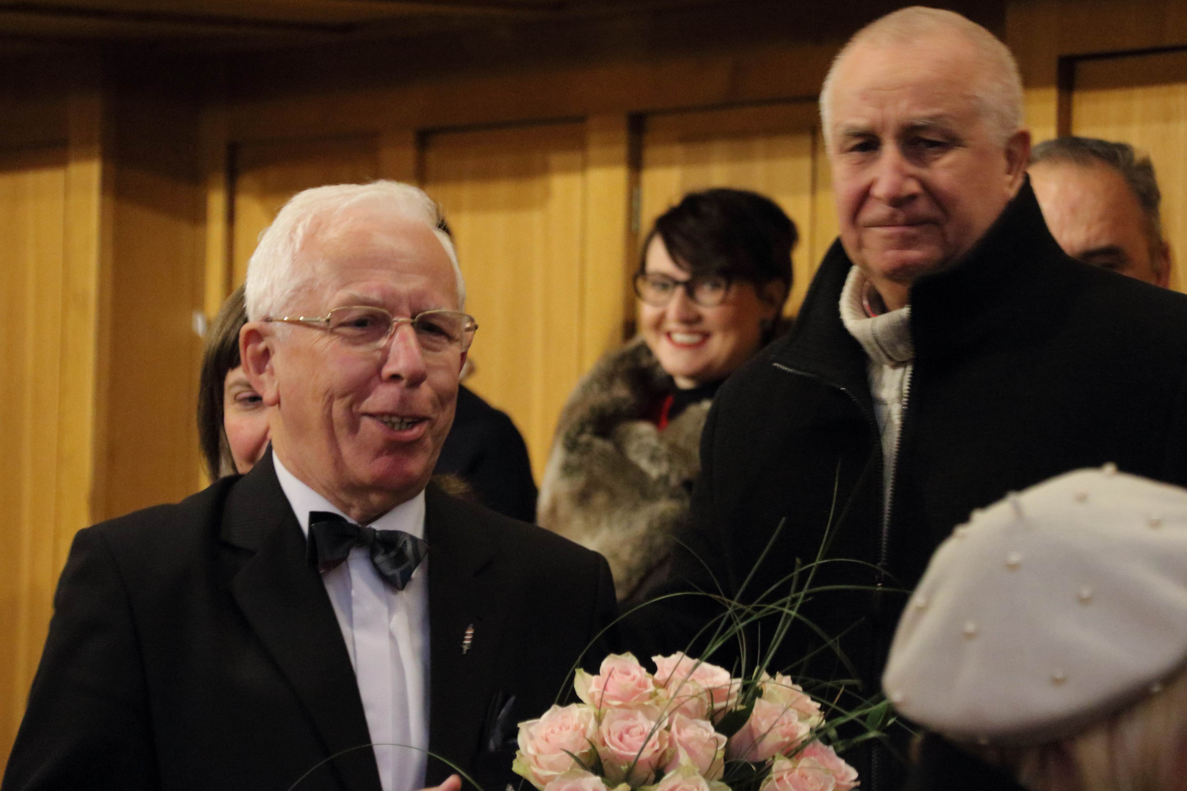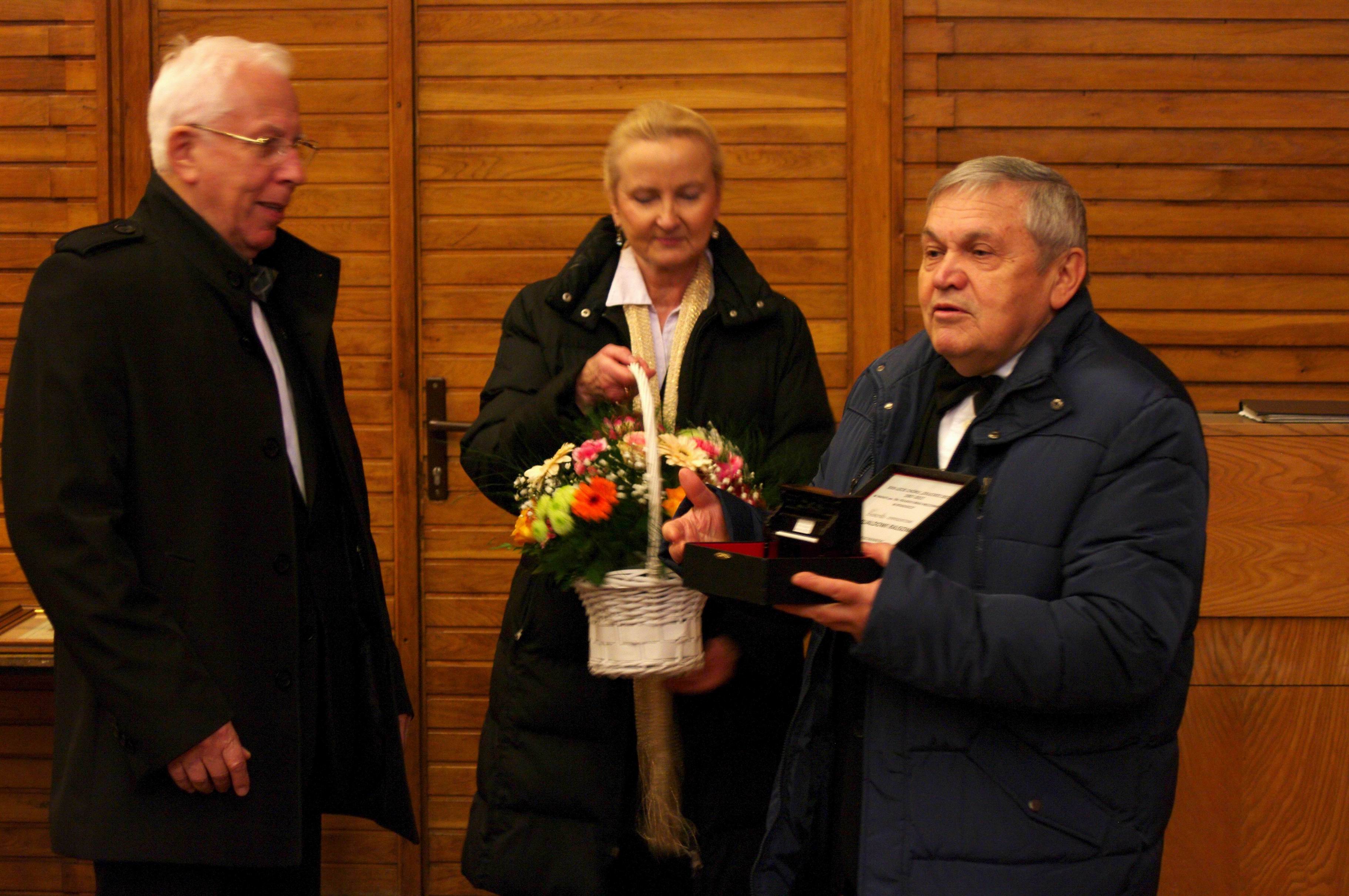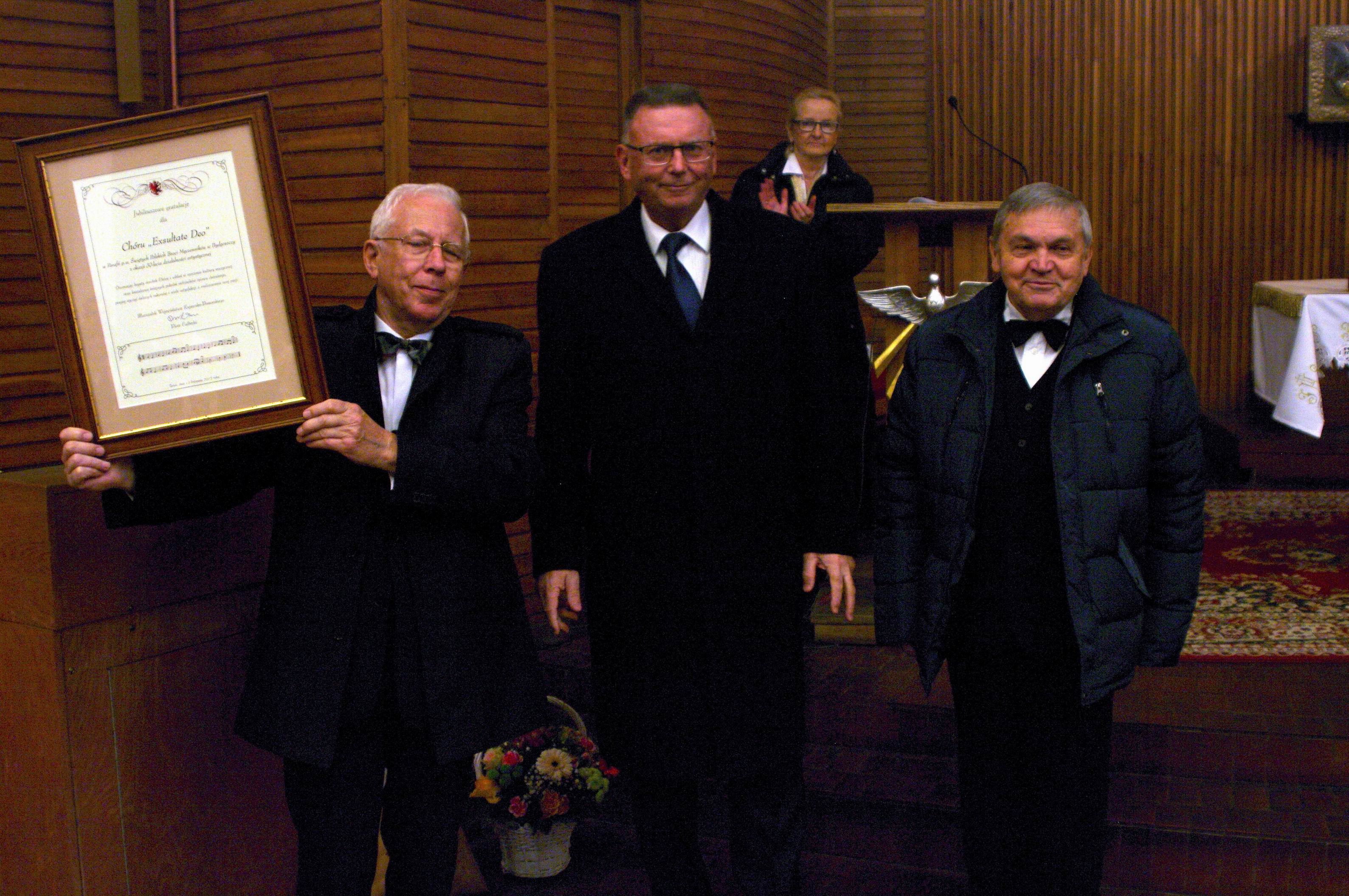 Na zakończenie tej części uroczystości zabrali głos, przekazali życzenia i kwiaty dla chóru zaproszeni Goście. Wicemarszałek Zbigniew Ostrowski wręczył chórowi okazały dyplom (fot. marszałek_1) od Urzędu Marszałkowskiego Województwa Kujawsko-Pomorskiego a prezes Towarzystwa Miłośników Miasta Bydgoszczy Jerzy Derenda uhonorował chór piękną statuetką (fot. tmmb_1).