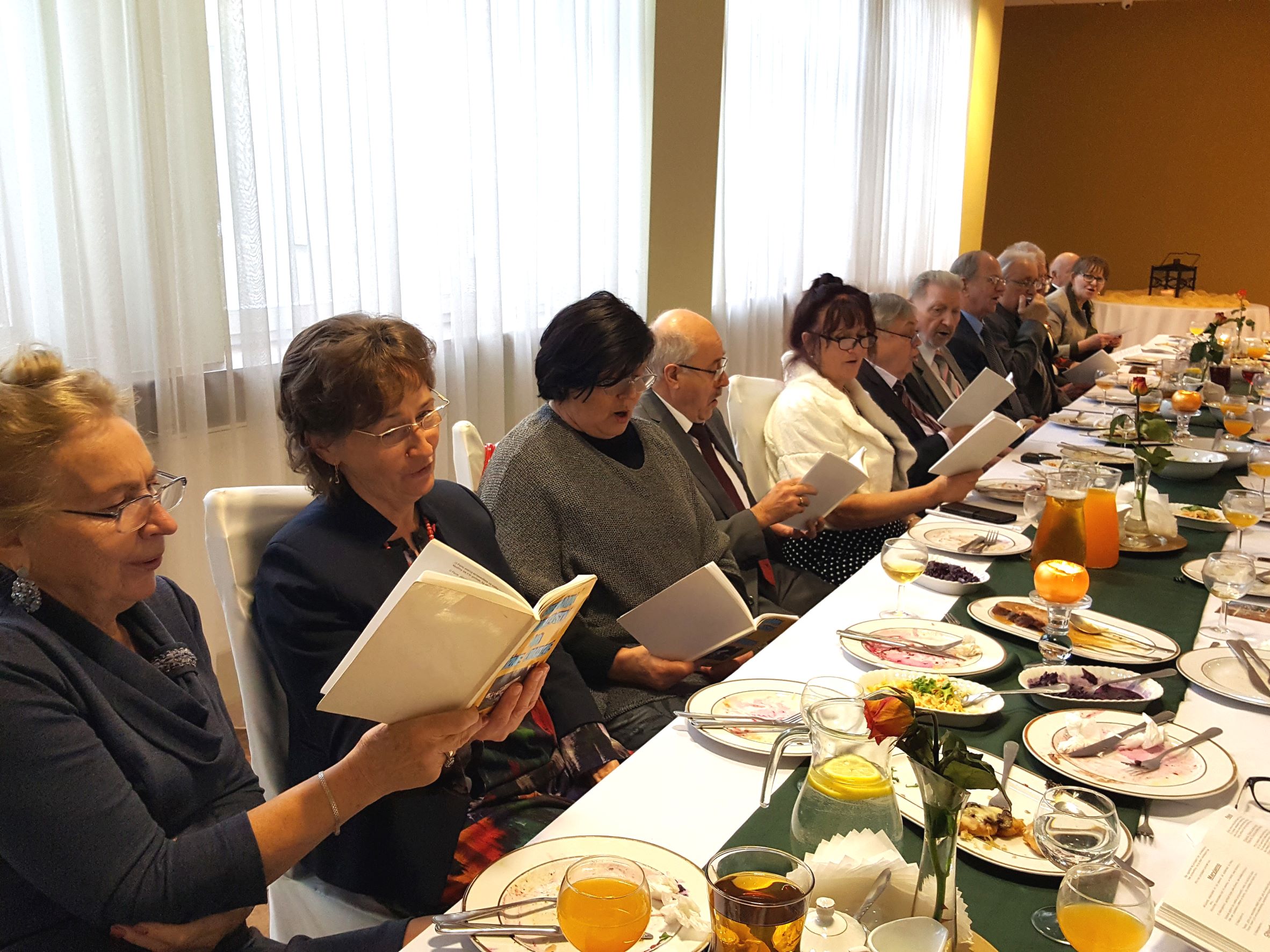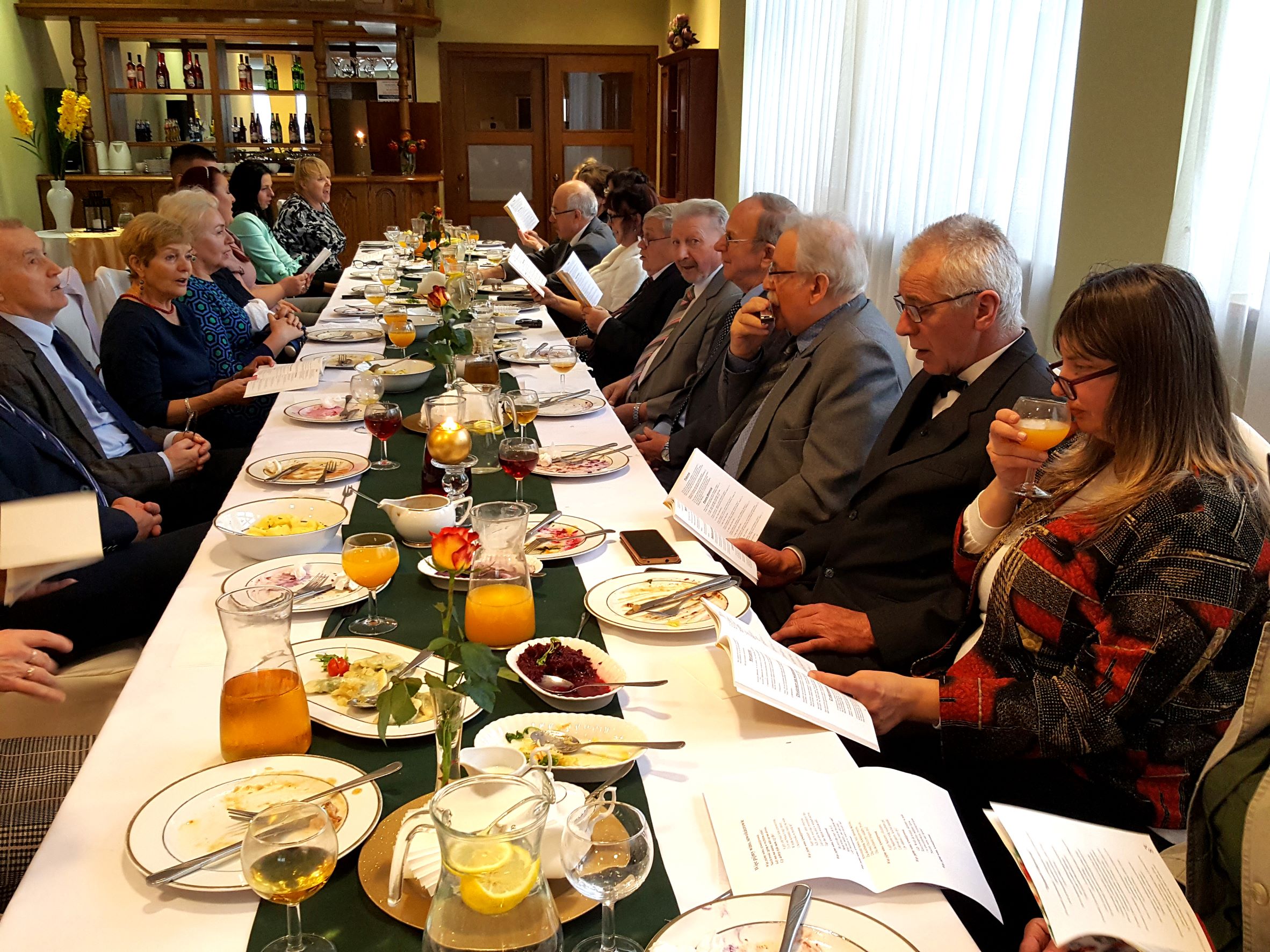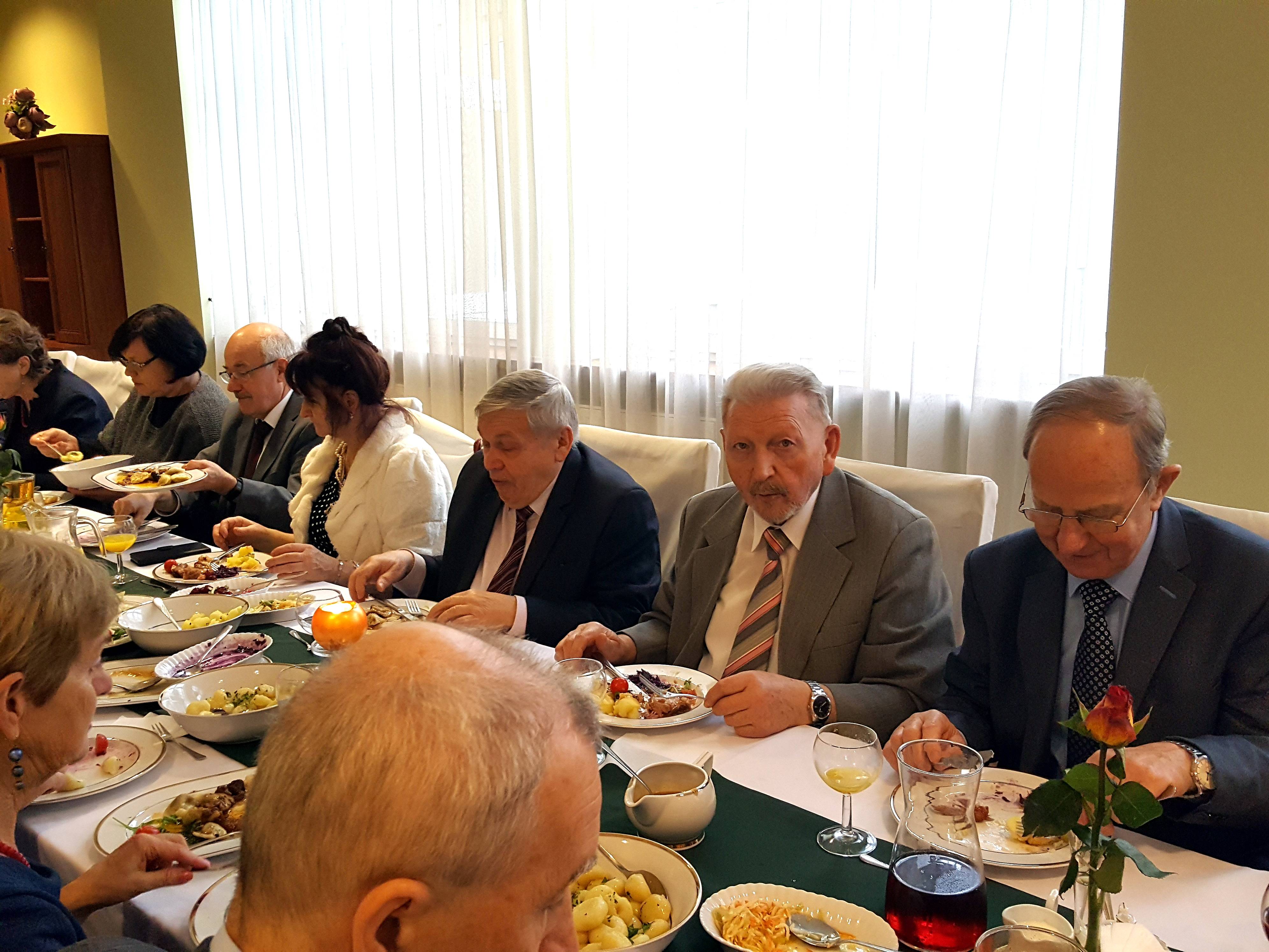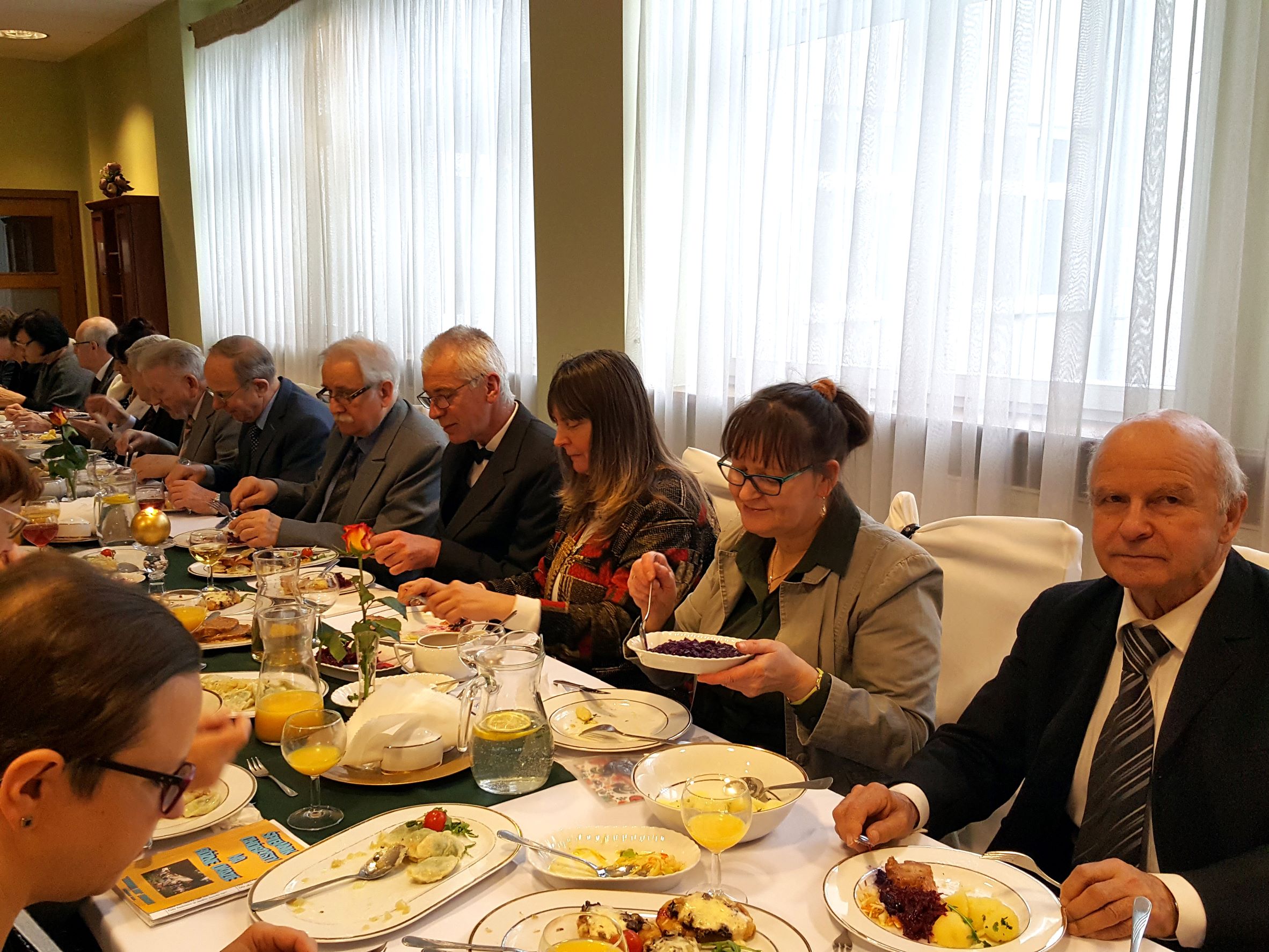 Na spotkanie przyszliśmy bezpośrednio po Mszy św. sprawowanej w Uroczystość Chrystusa Króla, w której uczestniczyliśmy śpiewem. Rozpoczęliśmy od bezalkoholowego toastu za dalsze istnienie i działanie naszego chóru. Z wielkim apetytem rozpoczęliśmy konsumpcję uroczystego obiadu, gdzie każdy mógł wybrać ulubione danie. Jak widać na prezentowanych zdjęciach, menu było wyśmienite i urozmaicone oraz cieszyło się powodzeniem chórzystów.