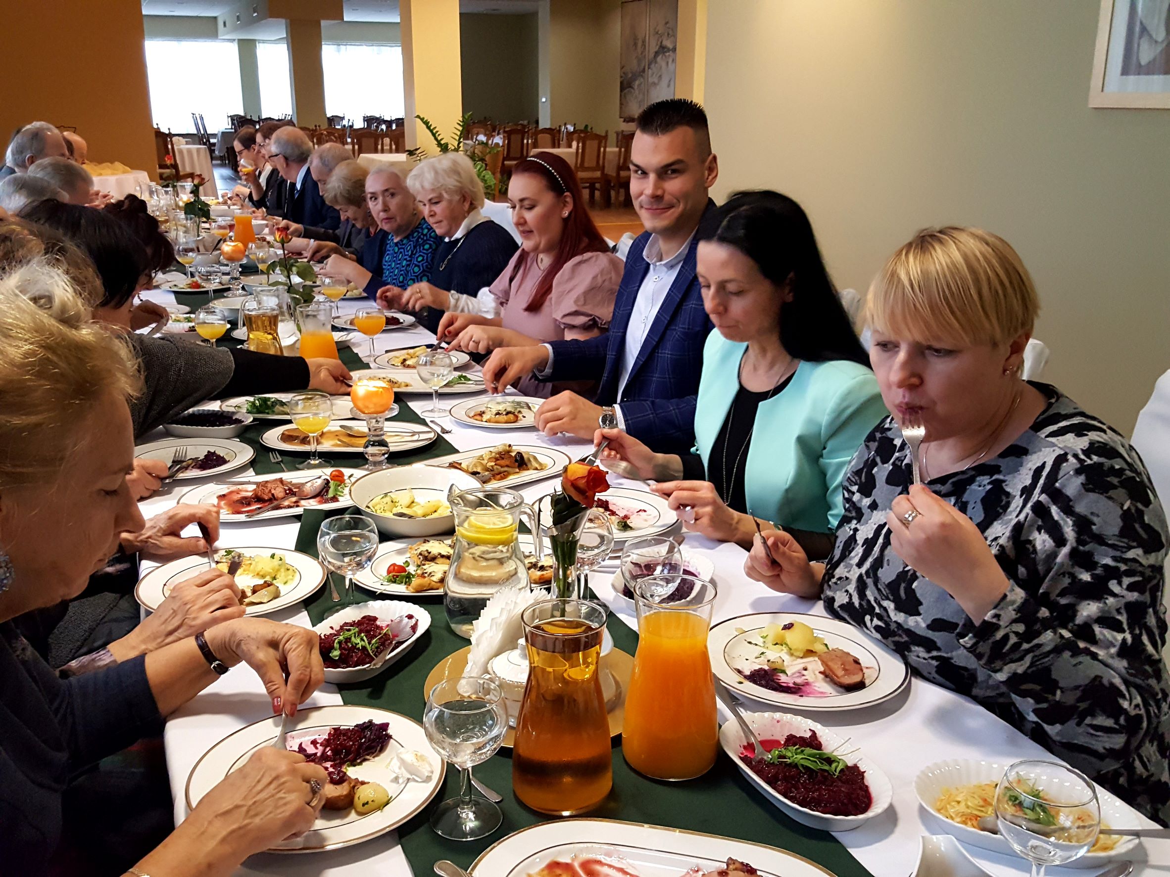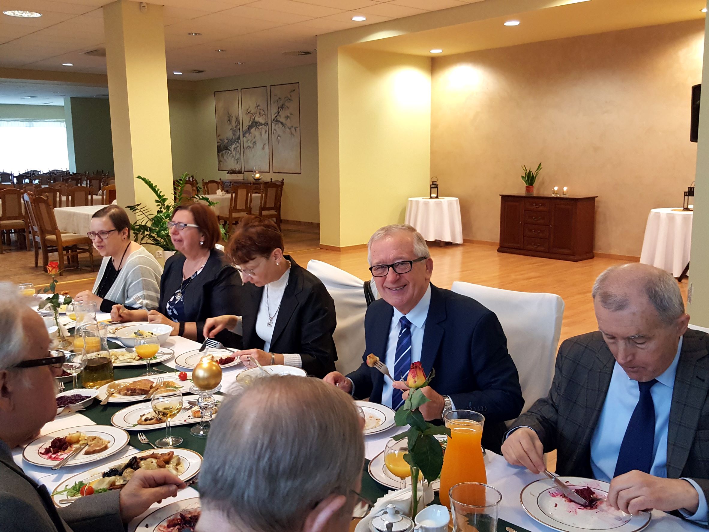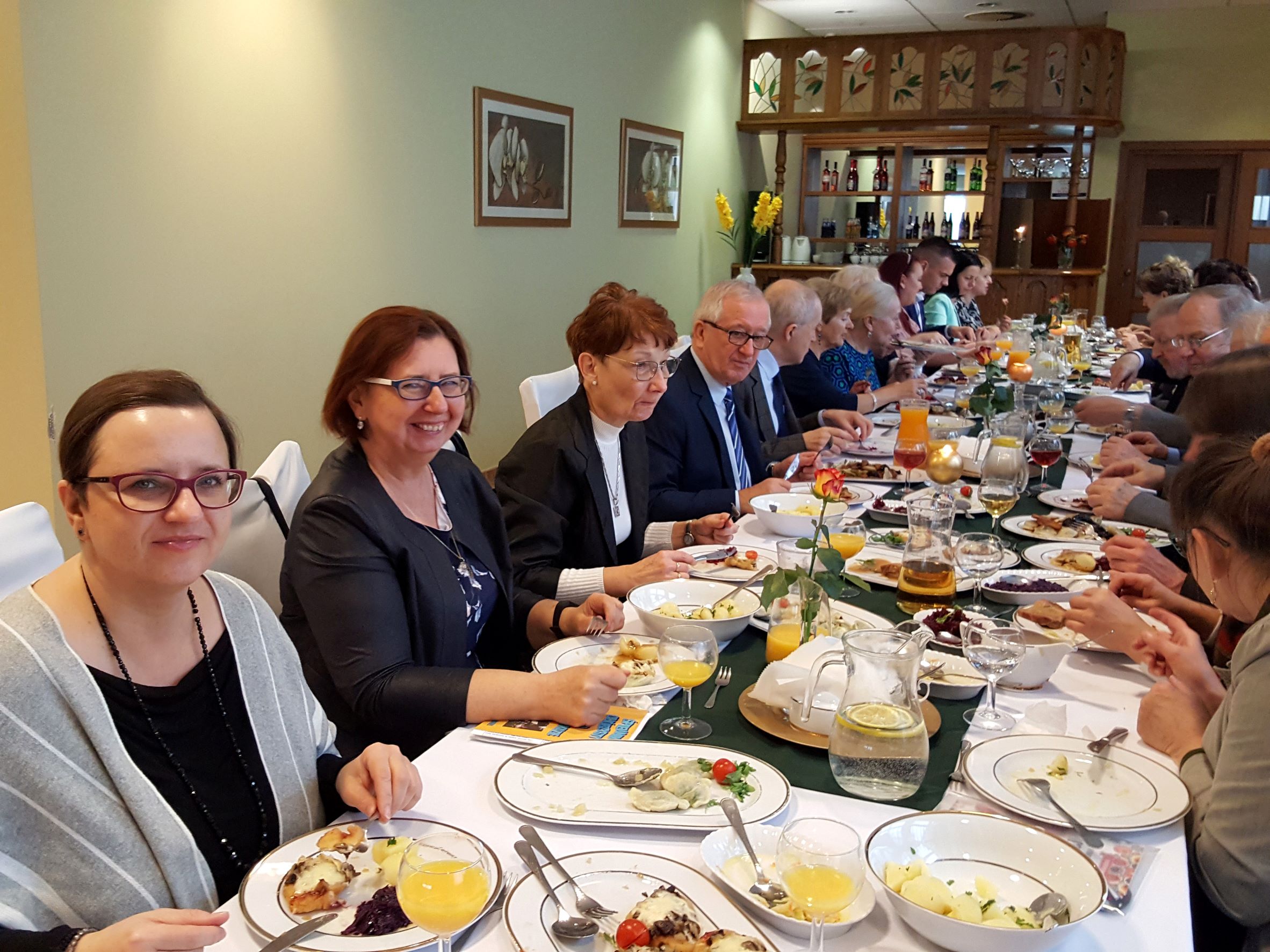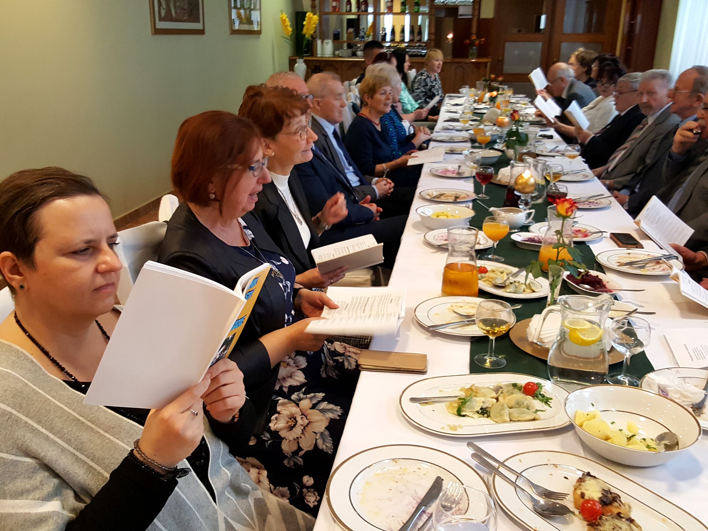 Na spotkanie przyszliśmy bezpośrednio po Mszy św. sprawowanej w Uroczystość Chrystusa Króla, w której uczestniczyliśmy śpiewem. Rozpoczęliśmy od bezalkoholowego toastu za dalsze istnienie i działanie naszego chóru. Z wielkim apetytem rozpoczęliśmy konsumpcję uroczystego obiadu, gdzie każdy mógł wybrać ulubione danie. Jak widać na prezentowanych zdjęciach, menu było wyśmienite i urozmaicone oraz cieszyło się powodzeniem chórzystów.