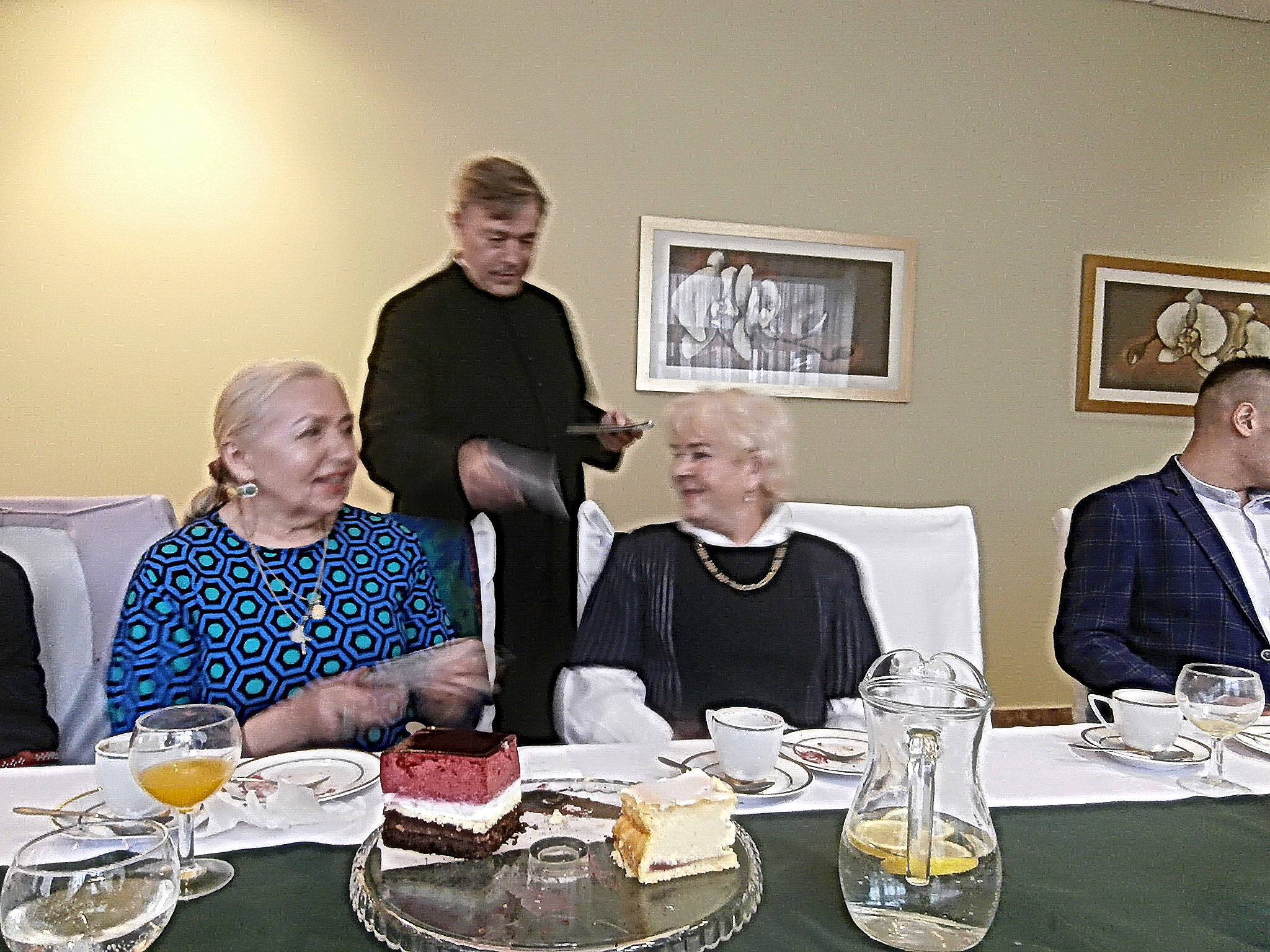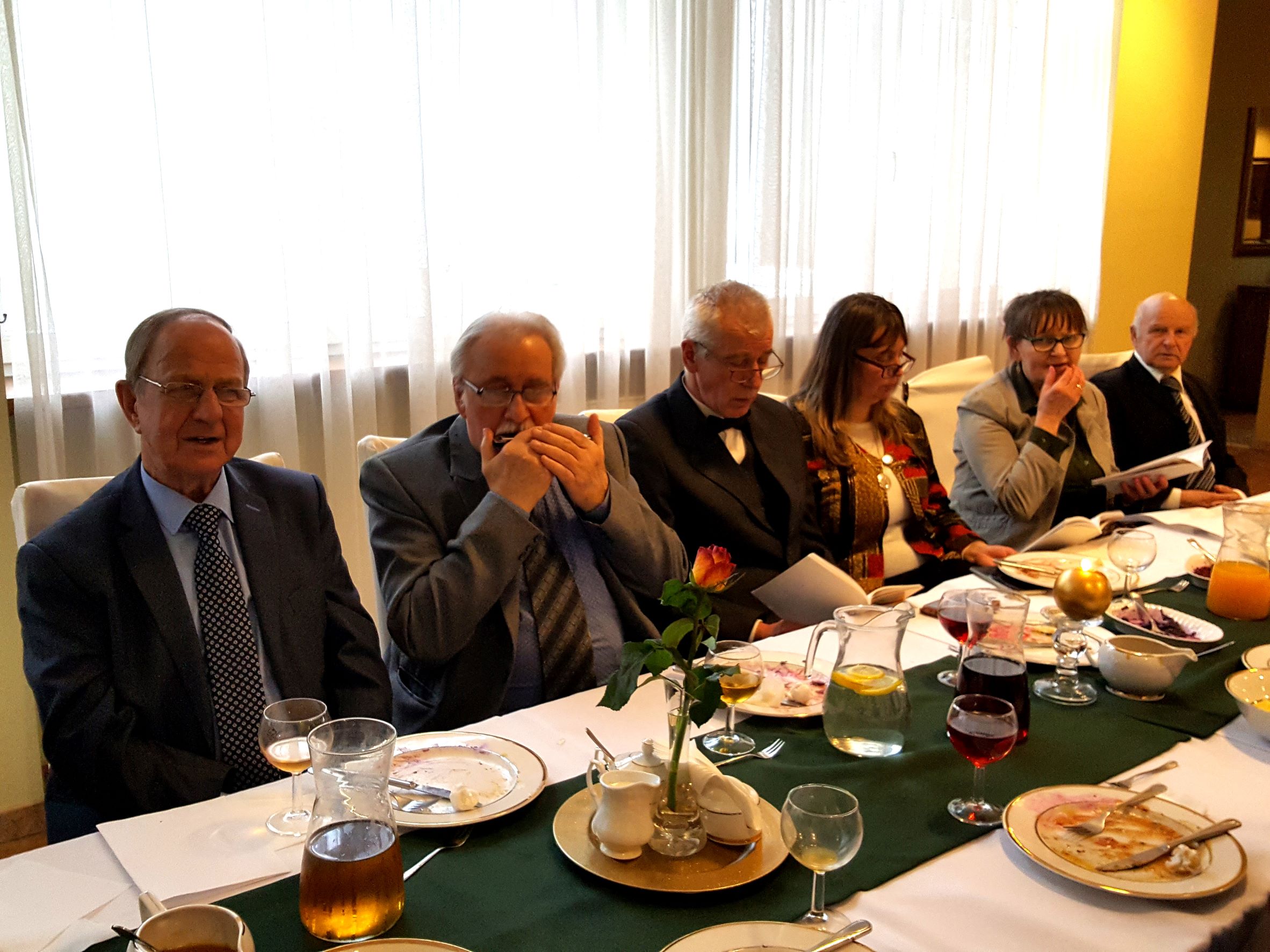 Po wyśmienitym i sutym obiedzie nabraliśmy chęci do wspólnego śpiewania. Wokalne popisy prezentowali nasi soliści – Natalia Kolanowska i Artur Ptaszyński pod czujnym okiem Dyrygenta. Swój talent solisty ujawnił też Adam Walter, wykonując po raz pierwszy samodzielnie przed naszym gremium piękną i nieznaną nam piosenkę. Do niektórych śpiewów akompaniował nam na organkach ustnych Maciej Dornowski. Góralskie piosenki inicjowała swym podhalańskim gromkim sopranem nasza Prezes - Hanka Twaróżek-Bułka. W trakcie spotkania odwiedził nas Opiekun chóru, nasz Proboszcz ks. prałat Józef Kubalewski, który pomimo wielu niedzielnych obowiązków znalazł czas, aby wypić z nami kawę i złożyć nam podziękowanie za naszą pracę i życzenia. Każdy z chórzystów otrzymał „Modlitewnik Adwentowy”.
