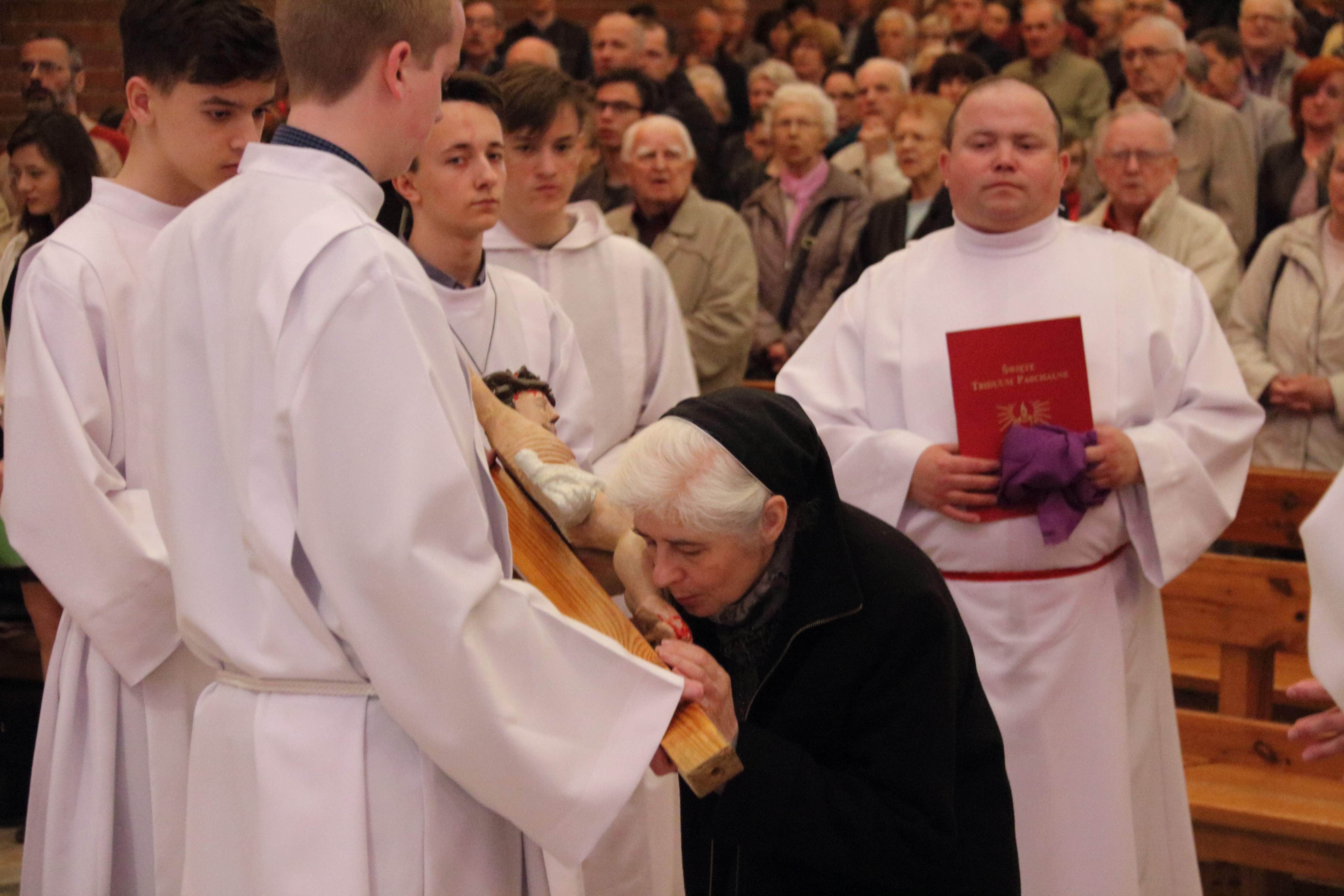 Wielki Piątek to dzień Krzyża. Po południu we wszystkich świątyniach katolickich odprawiana jest niepowtarzalna wielkopiątkowa Liturgia Męki Pańskiej. Celebrans i asysta wchodzą w ciszy. Następnie czyta się lub śpiewa, zwykle z podziałem na role, opis Męki Pańskiej według św. Jana. Po homilii w bardzo uroczystej modlitwie wstawienniczej Kościół poleca Bogu siebie i cały świat, wyrażając w ten sposób pragnienie samego Chrystusa: aby wszyscy byli zbawieni. Szczególnie przejmujące są modlitwy o jedność chrześcijan, za Żydów i za niewierzących.