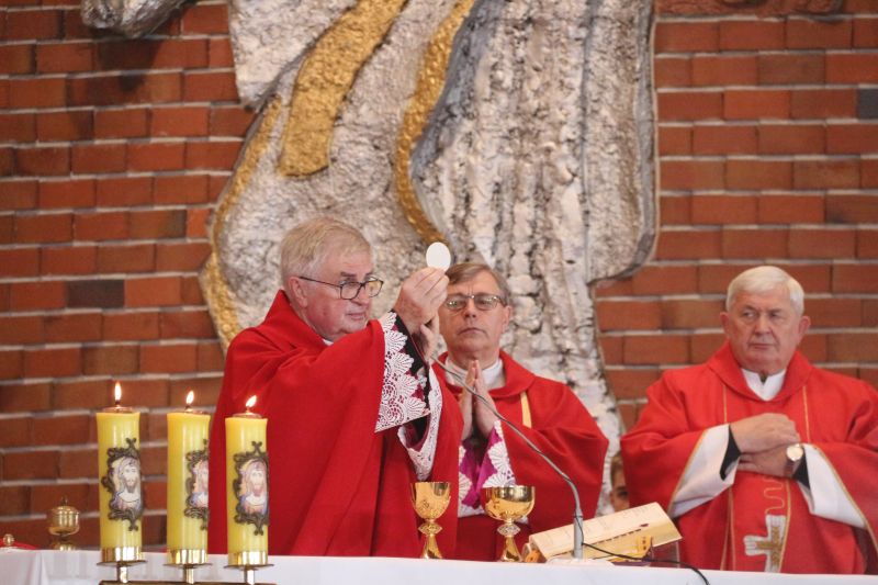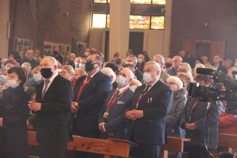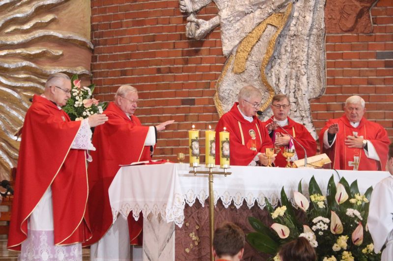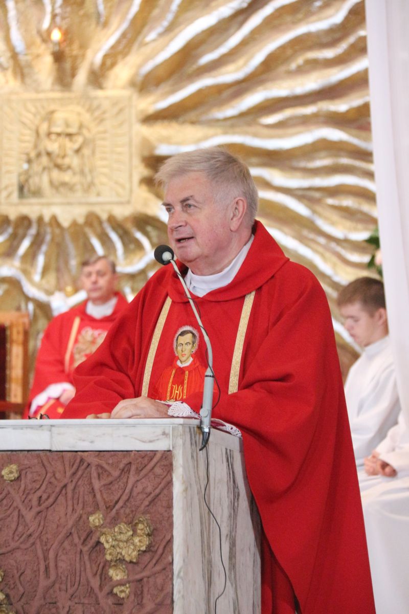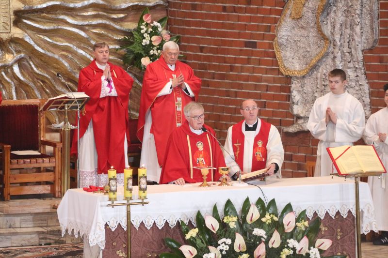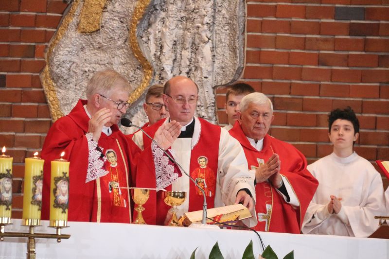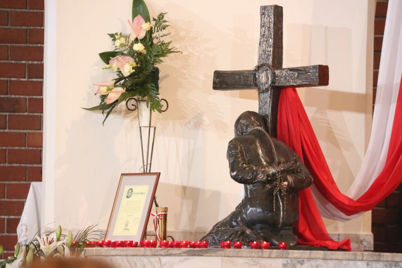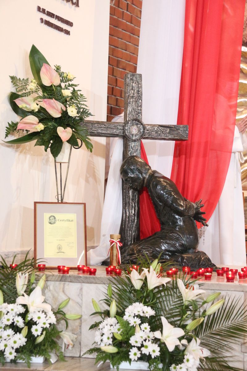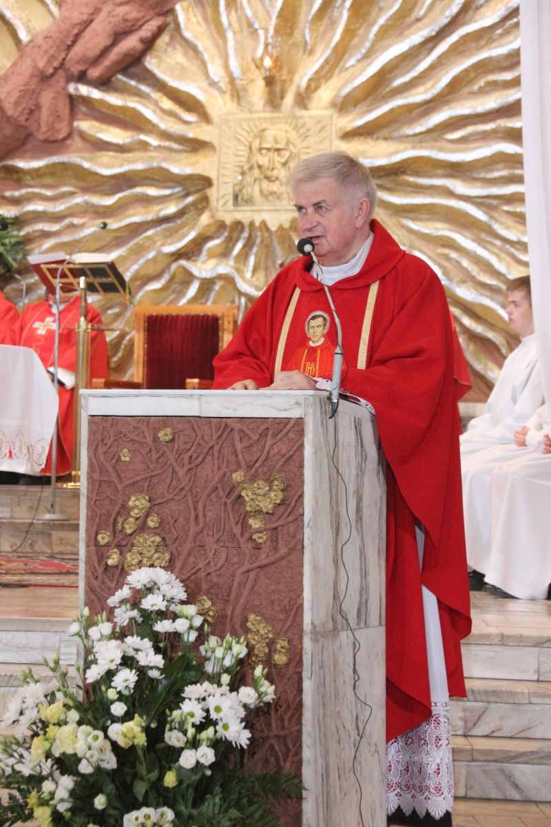 – Z tej świątyni wyruszył na męczeński szlak. Gromadzimy się przy jego relikwiach, wsłuchujemy w przesłanie i prosimy o orędownictwo przed Bogiem, by nasza wiara była coraz bardziej dojrzała – mówił na wstępie kustosz i proboszcz ks. prałat Józef Kubalewski. W świątyni modlili m.in. kapłani, przedstawiciele stowarzyszeń oraz delegacja osób Ogólnopolskiego Komitetu Pamięci Ks. Jerzego Popiełuszki z Warszawy, którym towarzyszył krzyż pątniczy, poświęcony na grobie błogosławionego. W czasie uroczystości siostrzenica błogosławionego Grażyna Siemion przekazała dla sanktuarium ziemię, pobraną z grobu męczennika.
