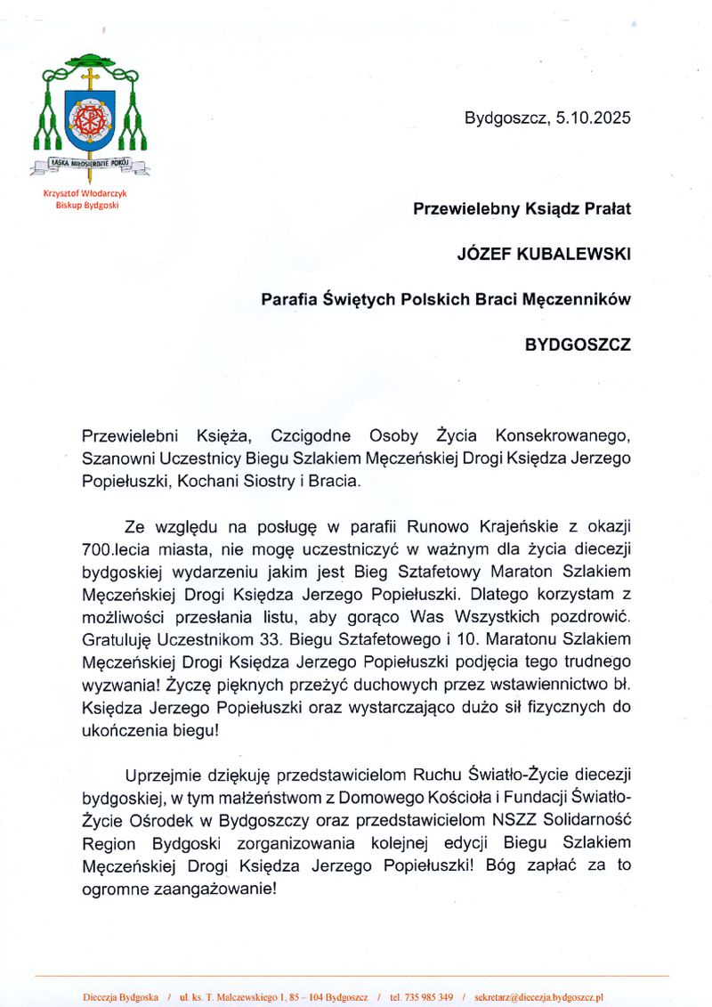 W dniu 19 października 2025 r. uroczysta Msza św. koncelebrowana w intencji kanonizacji bł. ks. Jerzego pod przewodnictwem Ks. Biskupa Krzysztofa Włodarczyka. Razem z nami modlili się członkowie Rycerskiego i Szpitalnego Zakonu Św. Łazarza z Jerozolimy z Wielkim Przeorem Przeoratu Polski Krzysztofem Polasik Lipińskim, a także alumni Arcybiskupiego Wyższego Seminarium Duchownego w Poznaniu wraz z księżmi Moderatorami. Po Mszy św. odbył się Koncert poświęcony bł. Ks. Jerzemu pt. „Na zawsze w naszych sercach” w wykonaniu zespołu „Muzyczna Odyseja” państwa Beaty Jasik i Zbigniewa Nierychlewskiego z Torunia. Msza była transmitowana przez TVP Polonia.